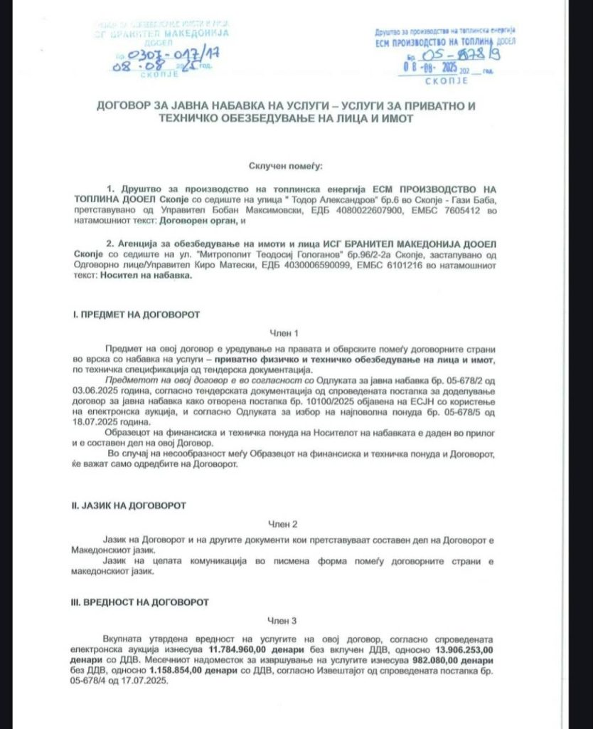 Особено загрижува фактот што истото лице веќе применило идентичен модел во ЕСМ Производство (производство на топлинска енергија), каде што спровело тендер во вредност од 12.000.000 денари без ДДВ за обезбедување на два објекта, од кои едниот се наоѓа во истиот круг со управната зграда на ЕСМ Дистрибуција. Овој факт укажува на намерно дуплирање на трошоци за објекти кои физички се наоѓаат во ист простор и се веќе покриени со обезбедување, што ја прави ваквата набавка целосно неоправдана и економски нелогична.